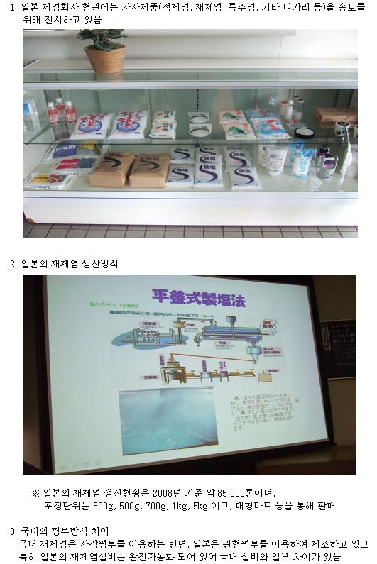 고즙 관련 협화화학공업주식회사, 재제염 및 정제염 관련 일본해수 사누키공장, 정제염 관련 나이까이염업 주식회사, 재제염 관련 금해 Salt 주식회사 등의 많은 회사를 방문하여 설비 등을 견학하고 관련 기술협의 및 교육을 받았습니다.